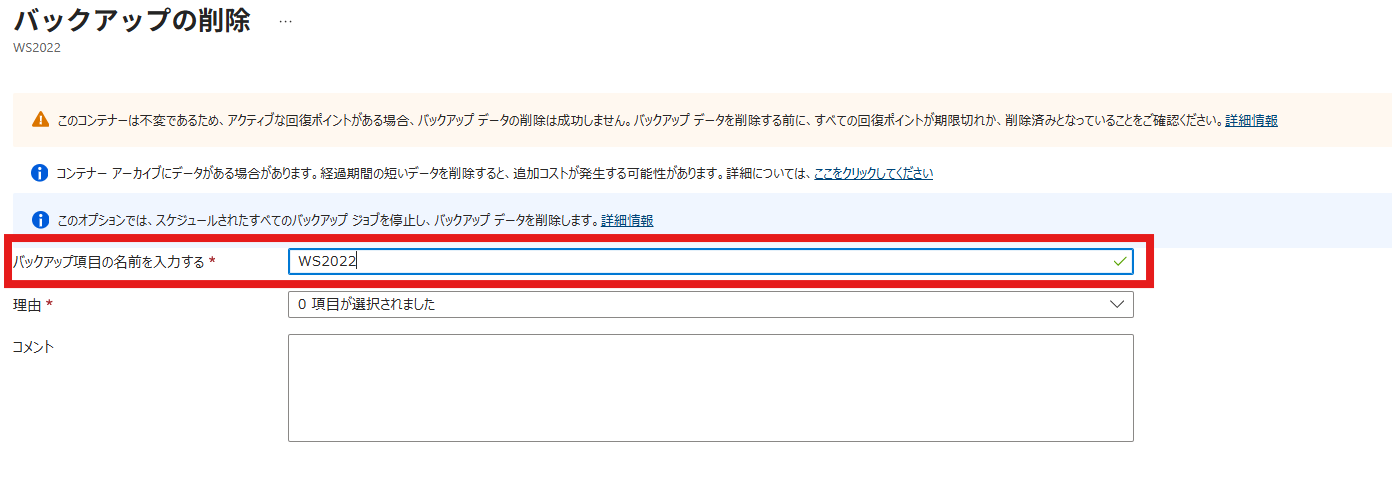バックアップ項目の名前を入力し、削除 をクリック