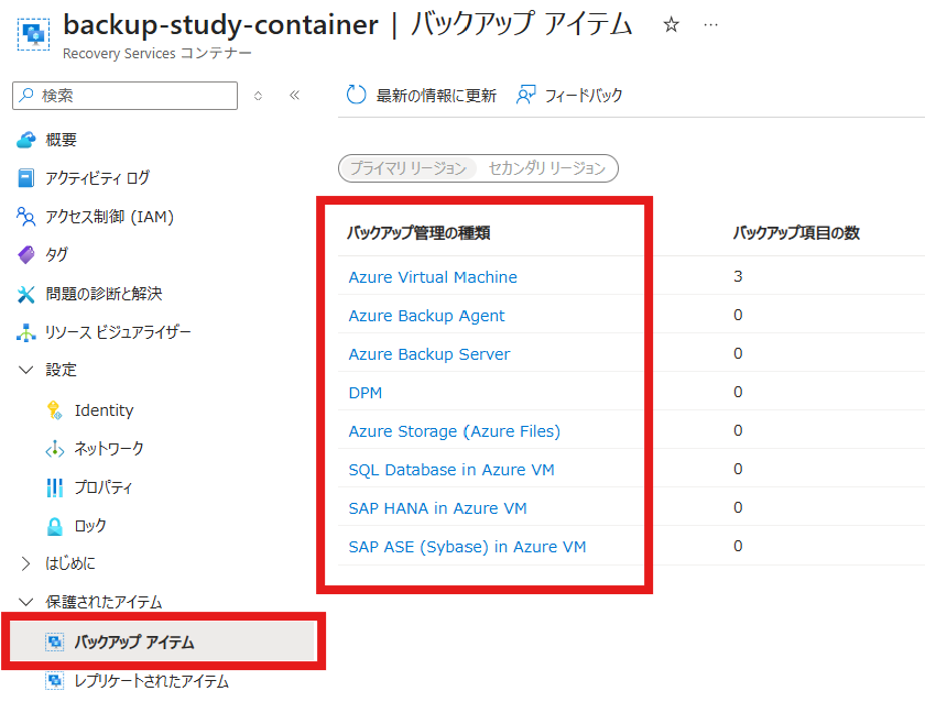 Recovery Services コンテナーの[保護されたアイテム]→[バックアップアイテム]からバックアップの種類を選択