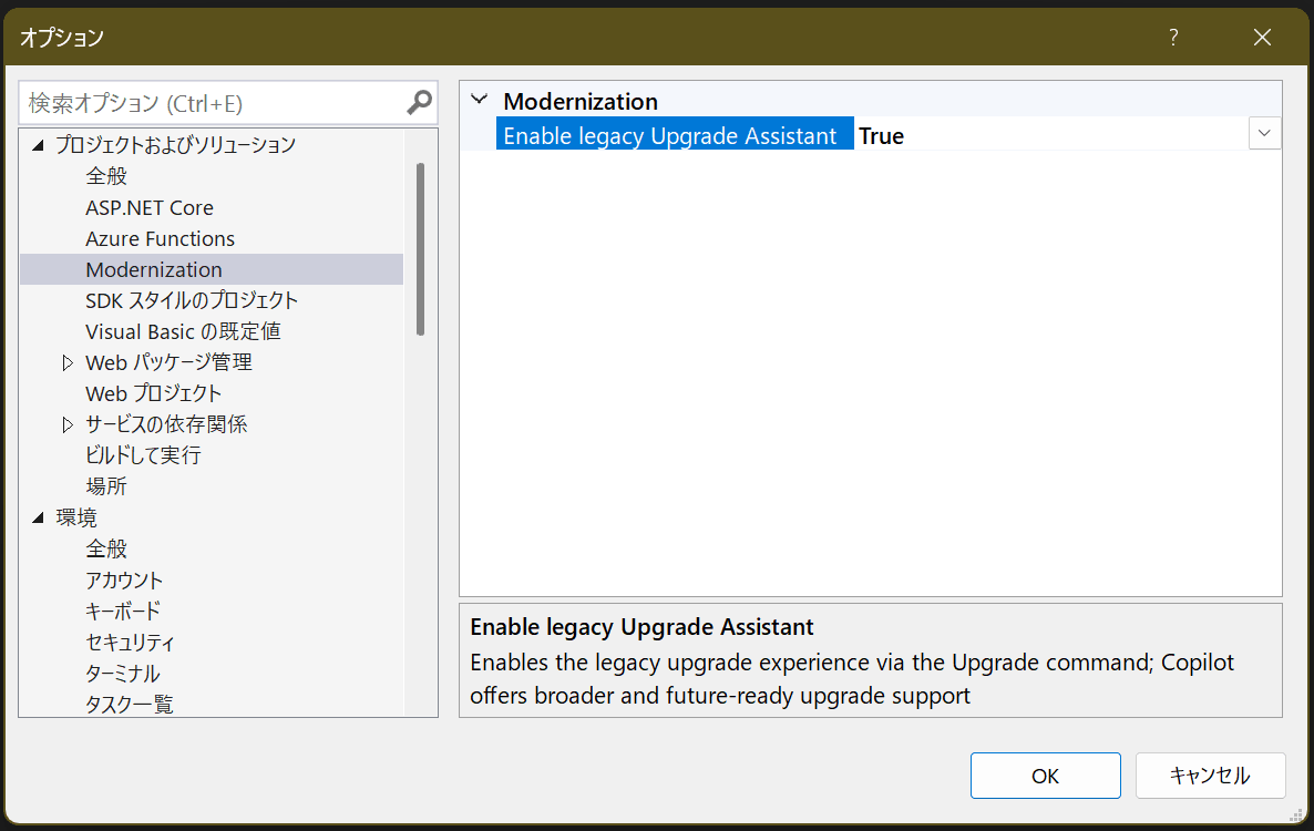 これの最後で言われているのですが Visual Studio に内包されていて、オプションの「プロジェクトおよびソリューション」の「Modernization」にある「Enable legacy Upgrade Assistant」を True にすることで使用できるようになります。