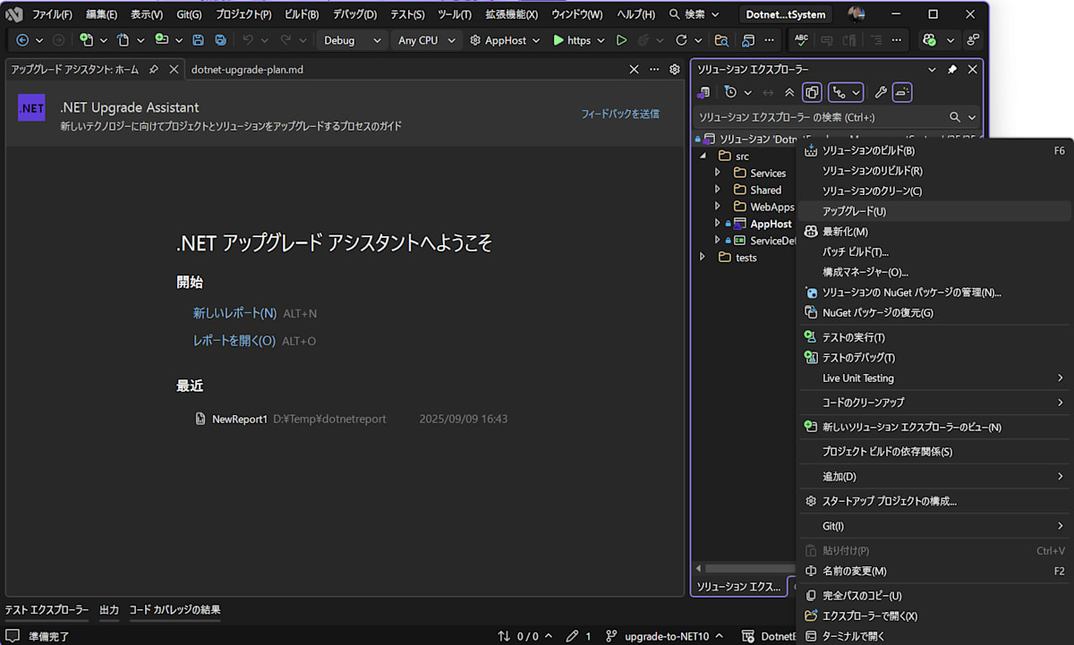 設定をオンにするとソリューションの右クリックメニューなどに .NET Upgrade Assistant の「アップグレード」メニューが表示されるようになります。