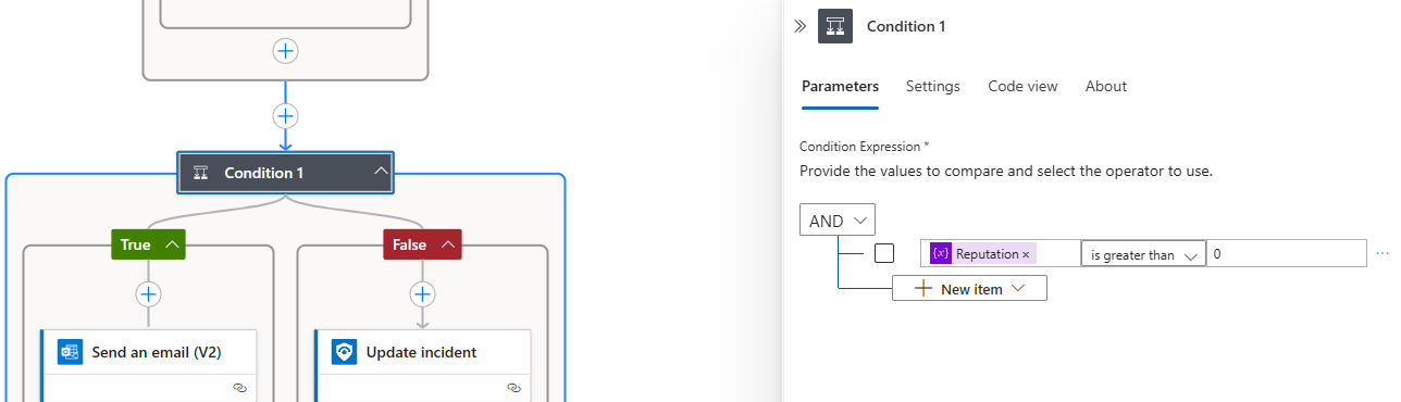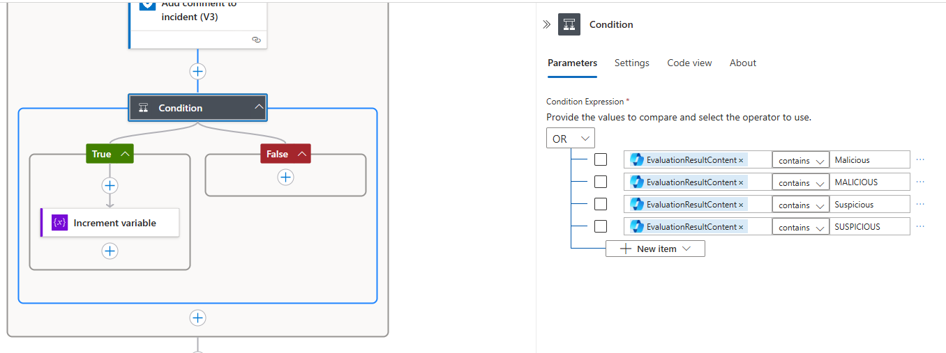 Condition を使用し、Security Copilot からの応答結果で有害と判断できる場合、フラグを 1 にします。念のため、条件には大文字小文字で指定しています。
