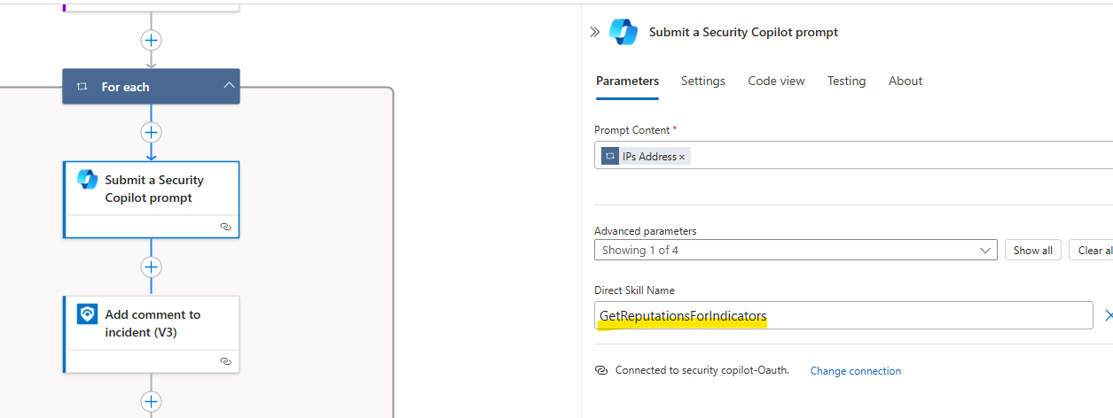 Direct Skill Name には [GetReputationsForIndicators] を指定しています。IP エンティティが Array 形式での取得になるため、For each 処理が自動的に追加されます。