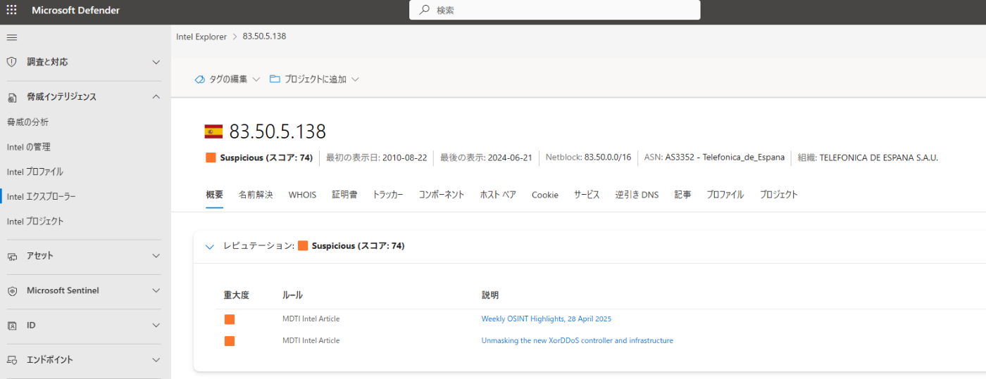 MSTI の Premium ライセンスを保有している場合や Security Copilot を使用している場合、Defender XDR ポータルの Intel エクスプローラーから以下のようにレピュテーションを確認することが可能です。