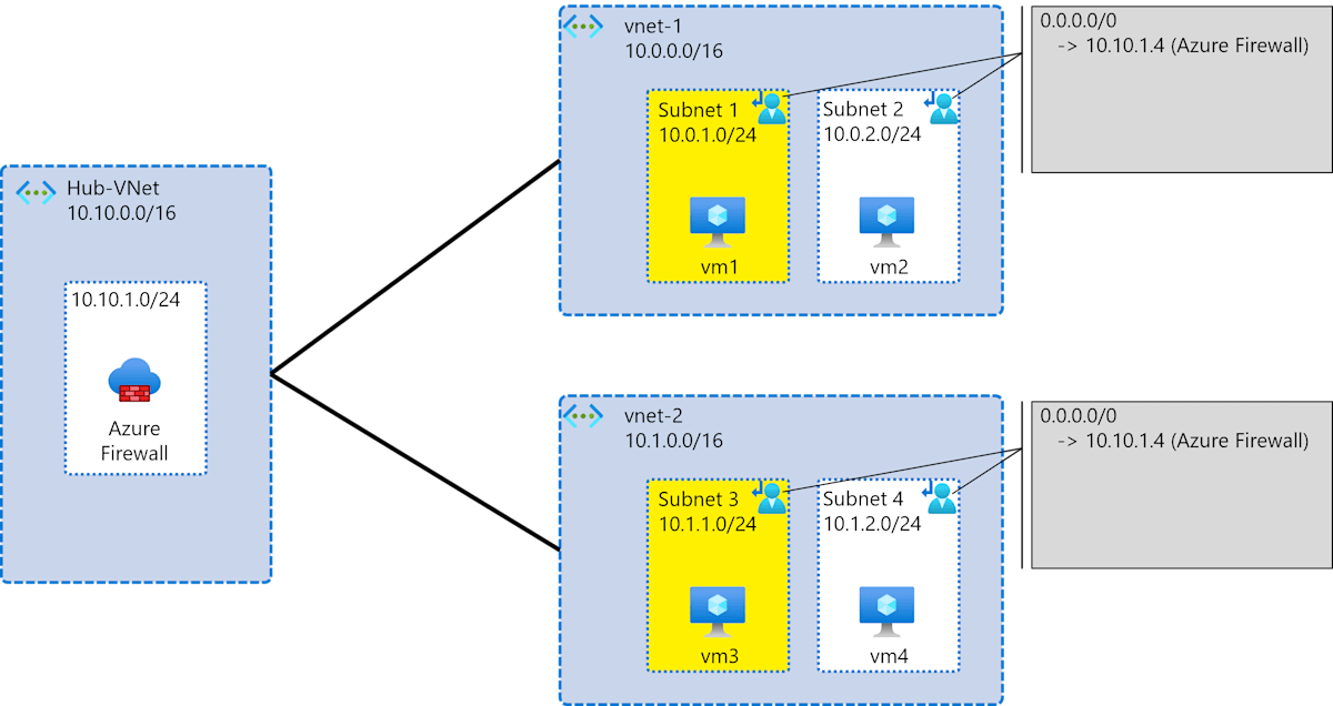 - Hub には Azure Firewall があり、Spoke の Vnet1 と Vnet2 はそれぞれ Hub と VNet Peering で接続されています。