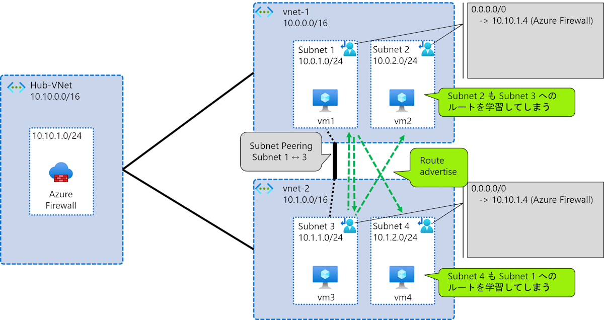 現時点では、vnet-1 の全ての subnet が subnet 3 へのルーティングを学習し、同様に Vnet-2 全ての Subnet が subnet 1 へのルーティング を学習するという挙動になります。