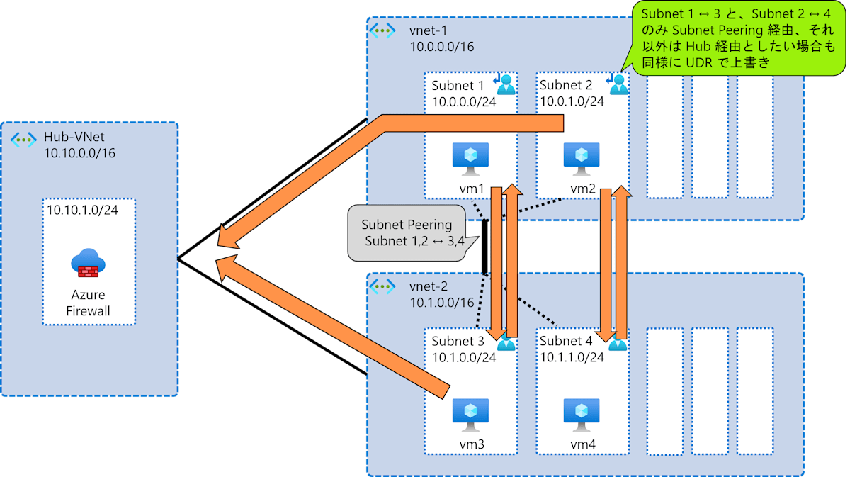 そのため、もし Subnet 1 と Subnet 3、 Subnet 2 と Subnet 4 を通信させたいが、それ以外の Subnet は従来通り Hub 経由にしたい/または疎通させたくないといった場合には、今回ご紹介した UDR による制御や、NSGでの制御が必要になります。