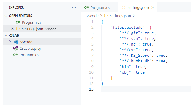 Visual Studio Code の設定の files.exclude にフォルダー名を追加することで、フォルダーを非表示にすることができます。ですが、これだと全フォルダーを開く際に非表示にされてしまうので、影響範囲が個人的には広すぎなのと .NET 系のフォルダーのときは bin や obj を消したくて JavaScript 系のときは node_modules を消したいみたいに設定を分けたいと思っていました。
