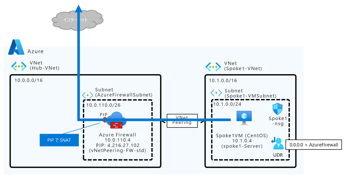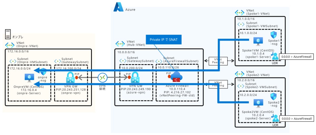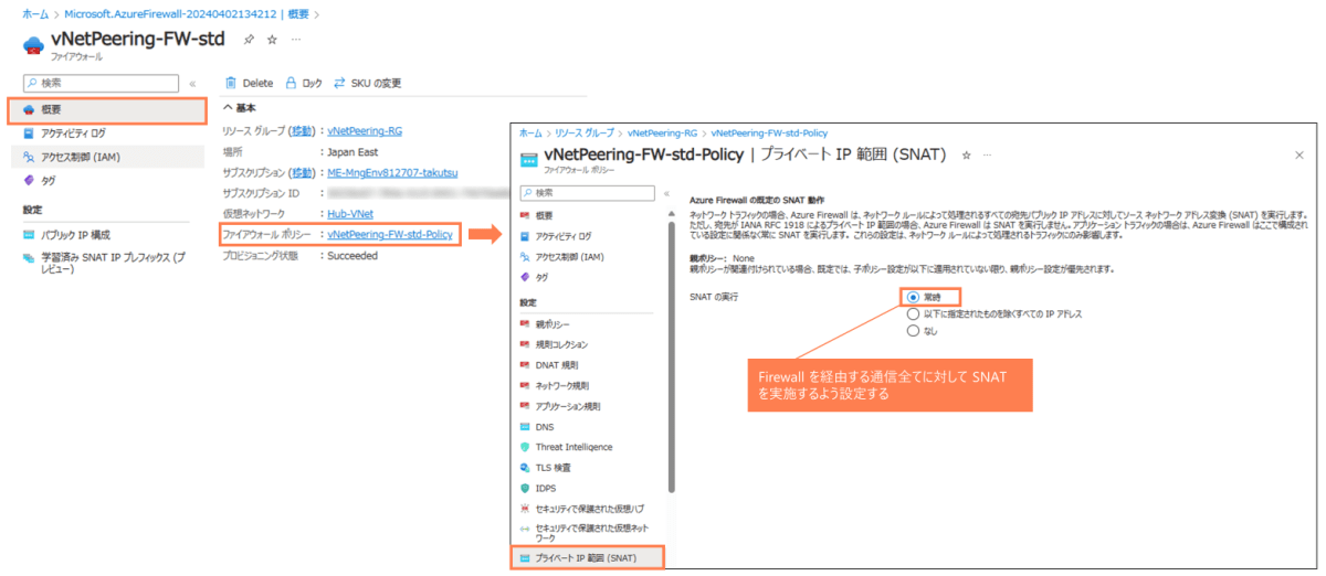 パターン1 の構成方法とほぼ同一ですが、SNAT の動作ポリシーを変更し、プライベート IP アドレスへの通信に対しても SNAT を実施するよう Azure Firewall で設定を行う必要があります