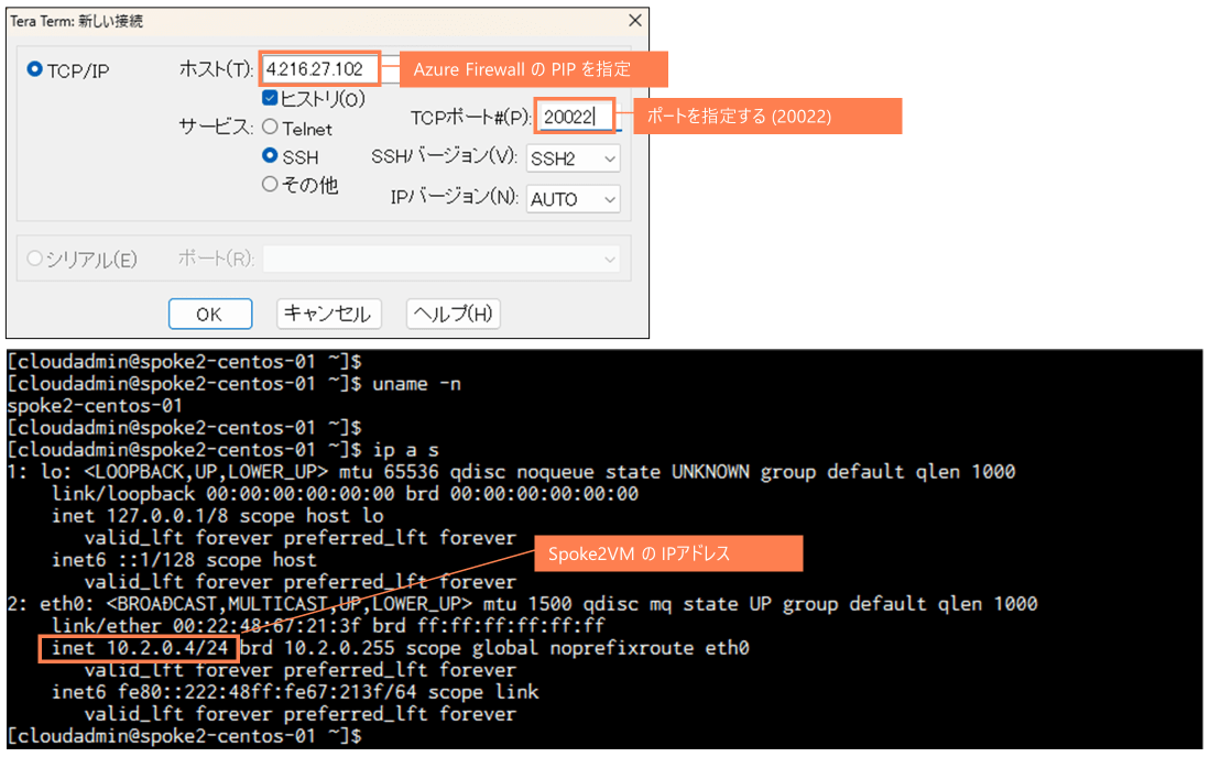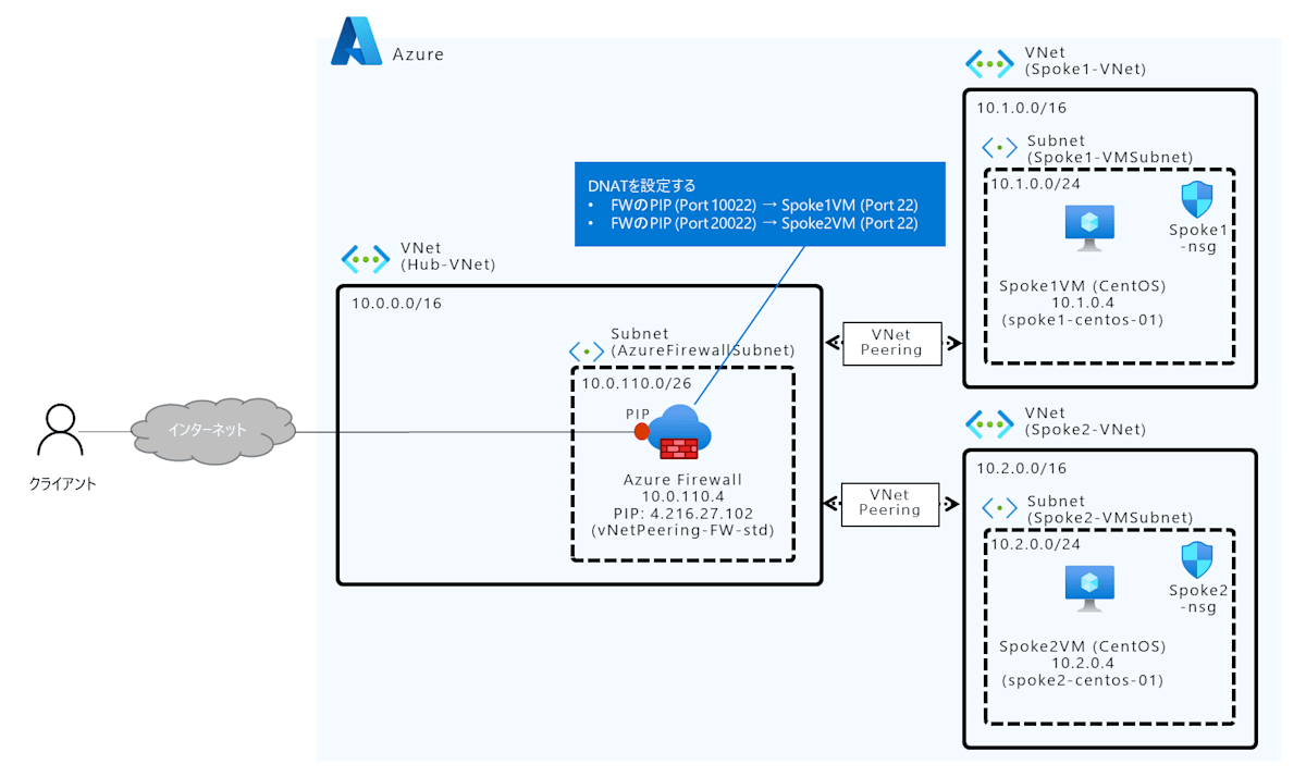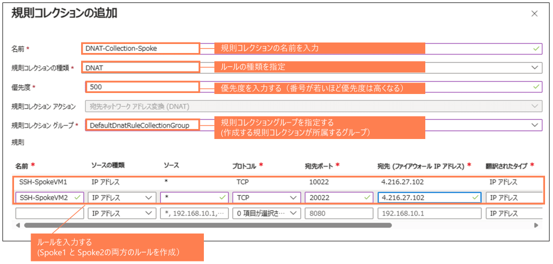 SSH-SpokeVM2 | IPアドレス | * | TCP | 20022 | 4.216.27.102 | IPアドレス | 10.2.0.4 | 22 |