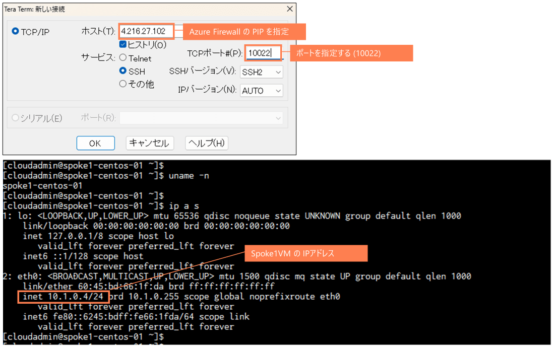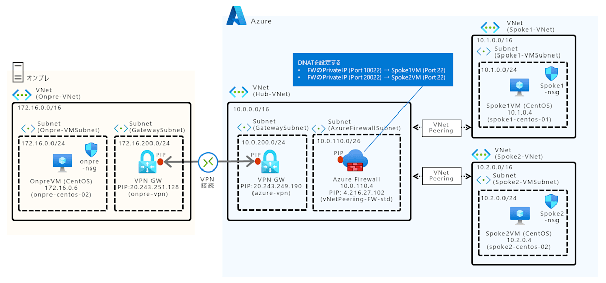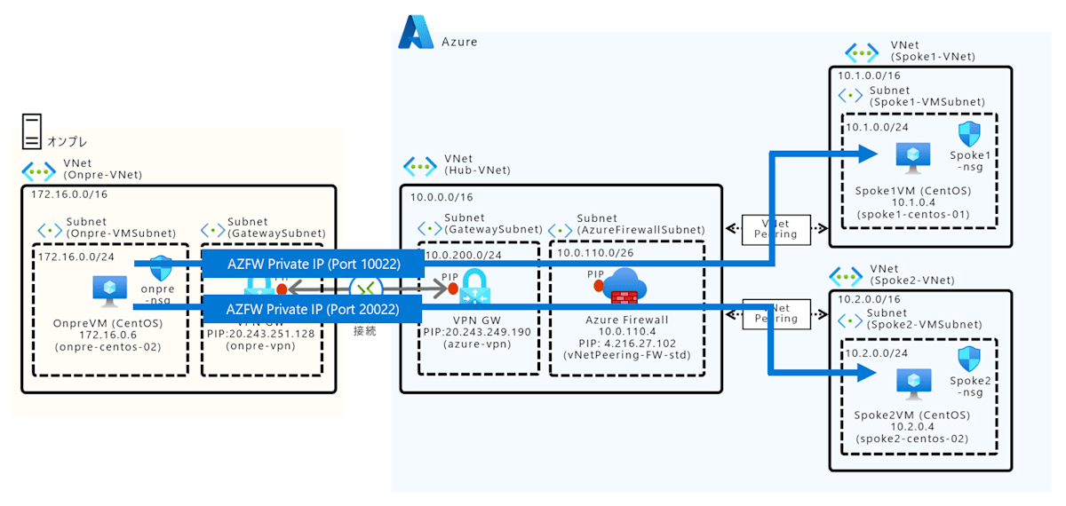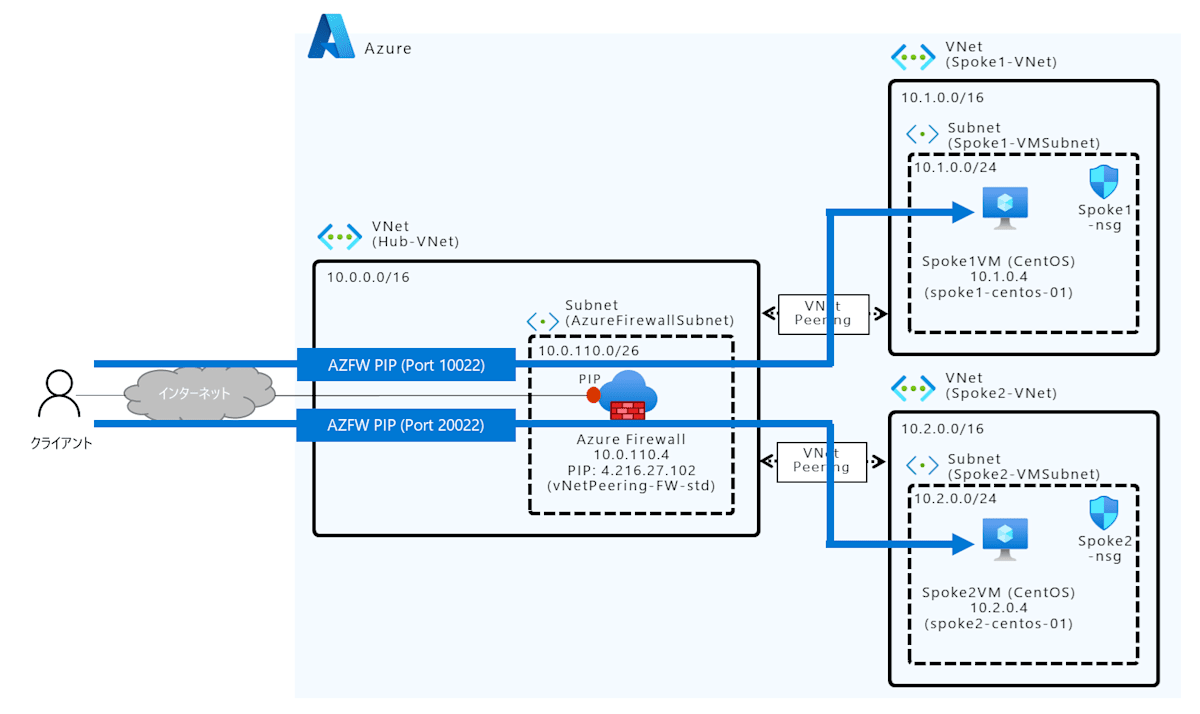 SSH-SpokeVM1 | IPアドレス | * | TCP | 10022 | 4.216.27.102 | IPアドレス | 10.1.0.4 | 22 |