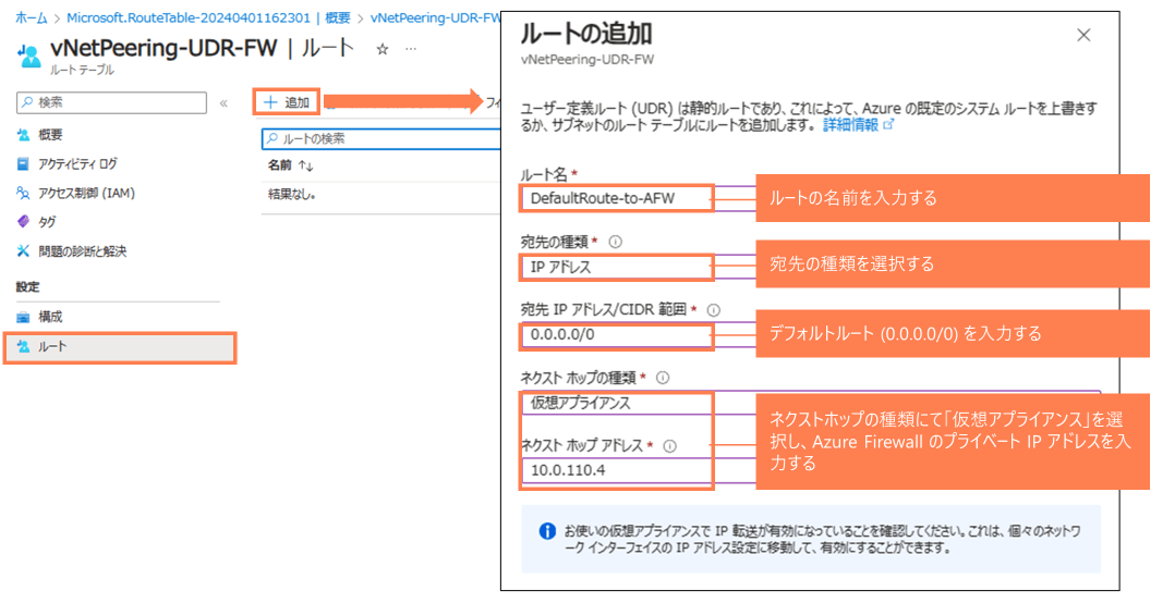 3-1. UDR を作成し、デフォルトルートを Azure Firewall に向ける