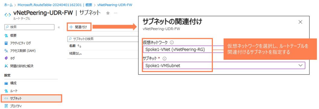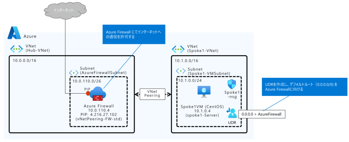 - UDR を作成し、デフォルトルートを Azure Firewall に向ける