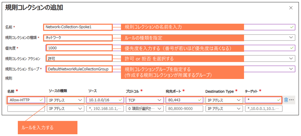 Spoke1 --> Internet に対するHTTP/HTTPS(80,443)通信を許可するルールを作成する
