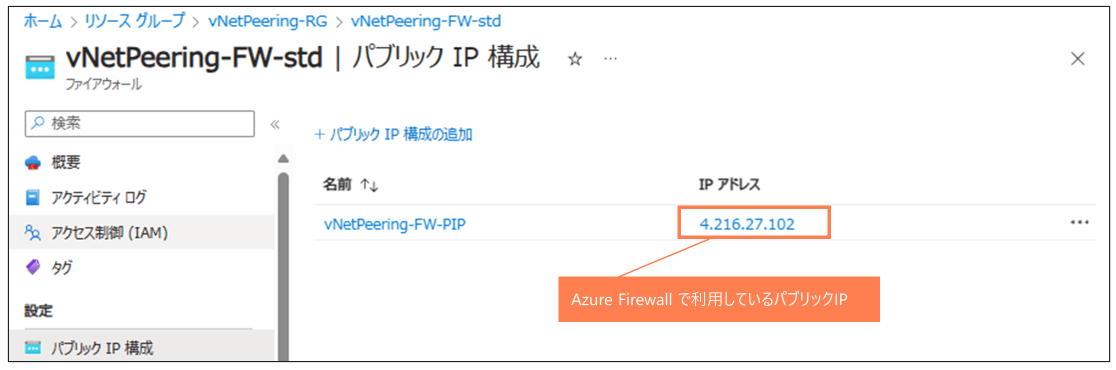 ( Azure Firewall のパブリック IP が表示されることを確認)