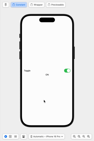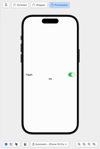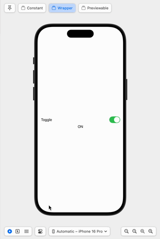 ビューがBindingプロパティラッパーに依存している場合、Previewable()マクロを使用して、そのプロパティの機能的なバインディングを作成し、プレビューに渡すことができます。このマクロは、DynamicPropertyプロトコルに準拠する任意の変数で動作します。