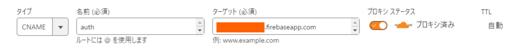 認証後のリダイレクト先となるカスタムドメインに対するレコードを以下のように設定します。