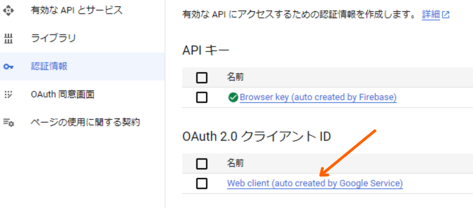 - 「GCPのConsole」→「APIとサービス」→「認証情報」に移動して、OAuth 2.0 クライアント IDのWeb Clientを選択。