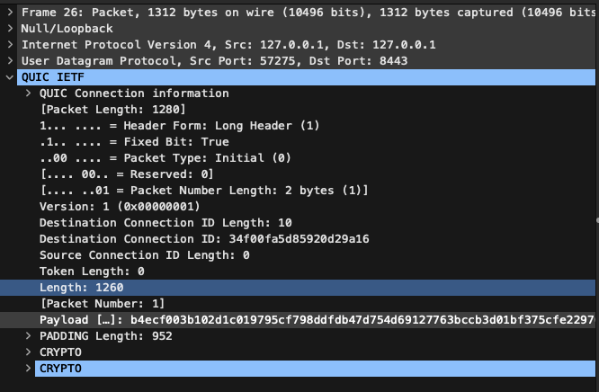 Clients MUST ensure that UDP datagrams containing Initial packets have UDP payloads of at least 1200 bytes, adding PADDING frames as necessary.↩︎ -