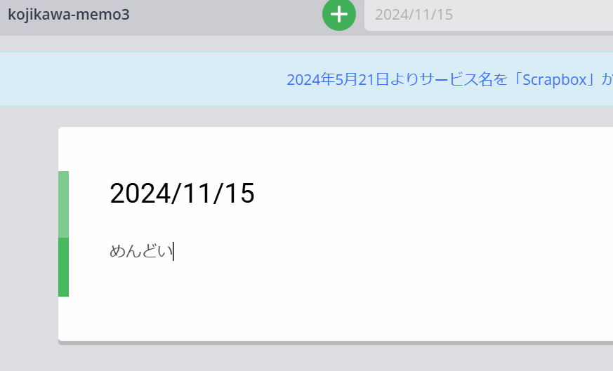 あなたのCosenseにアクセスすると、画面上部に緑のボタンがある。「+」。ページを追加・作成する、の、プラスだ。