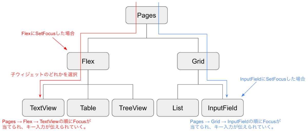 注意点として、フォーカスは入れ子構造のルートのウィジェットから末端のウィジェットまで順番に伝搬されていく形となります。