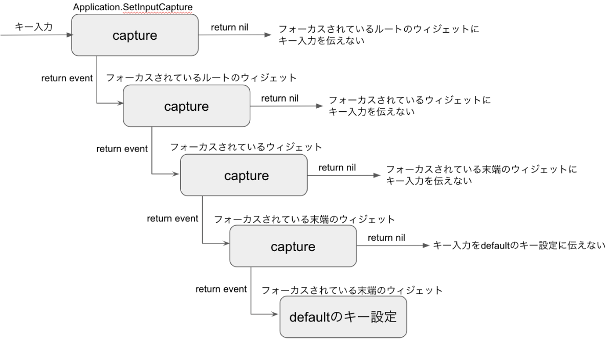 そのため、キー入力はルートのウィジェットのcapture関数から順番に処理され、末端のウィジェットのcapture関数やdefaultのキー設定へ伝えられていきます。