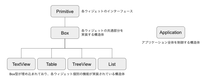 - Application: 各ウィジェットを実際に描画したり等、全体を制御する構造体