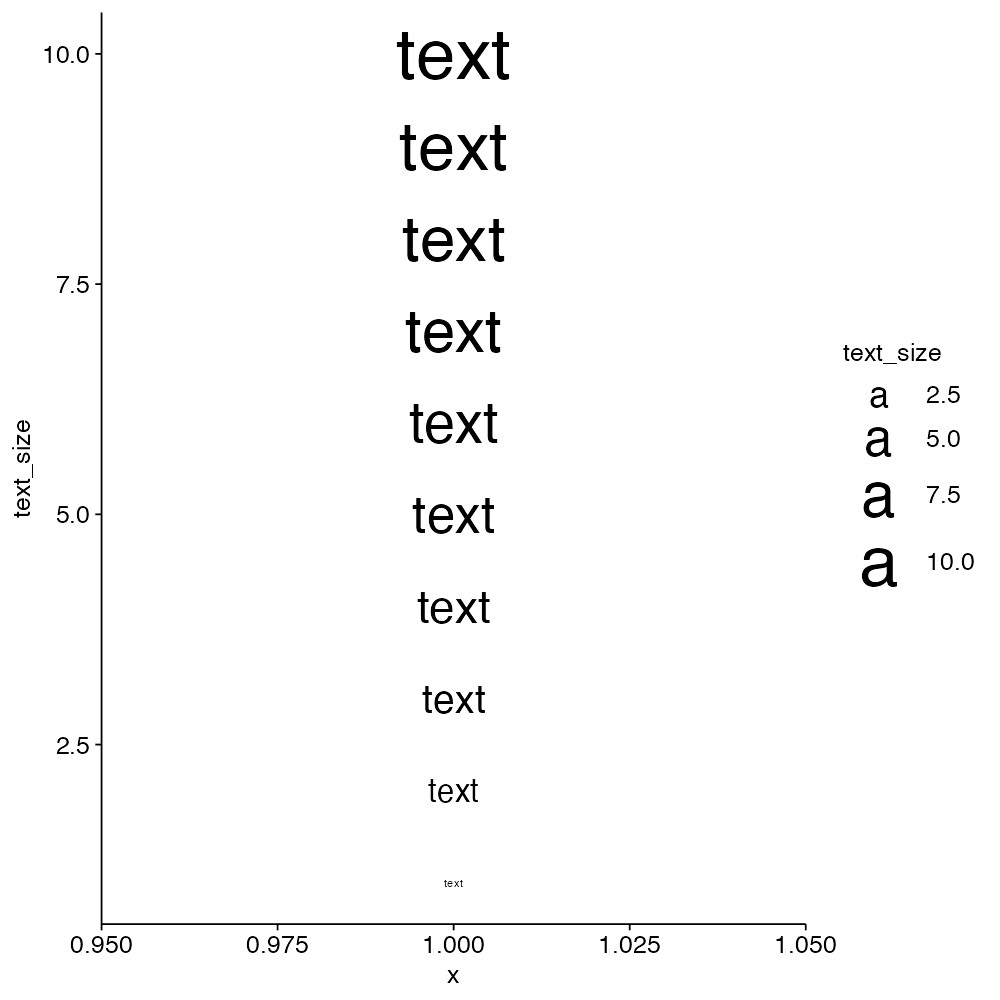 ggplot(aes(x = 1, y = text_size, label = "text", size = text_size)) +