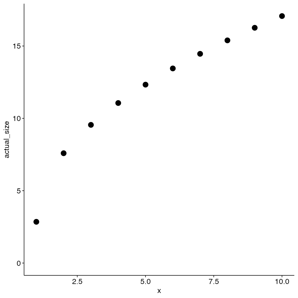 actual_size = c(2.85, 7.59, 9.55, 11.06, 12.33, 13.45, 14.46, 15.39, 16.26, 17.07),