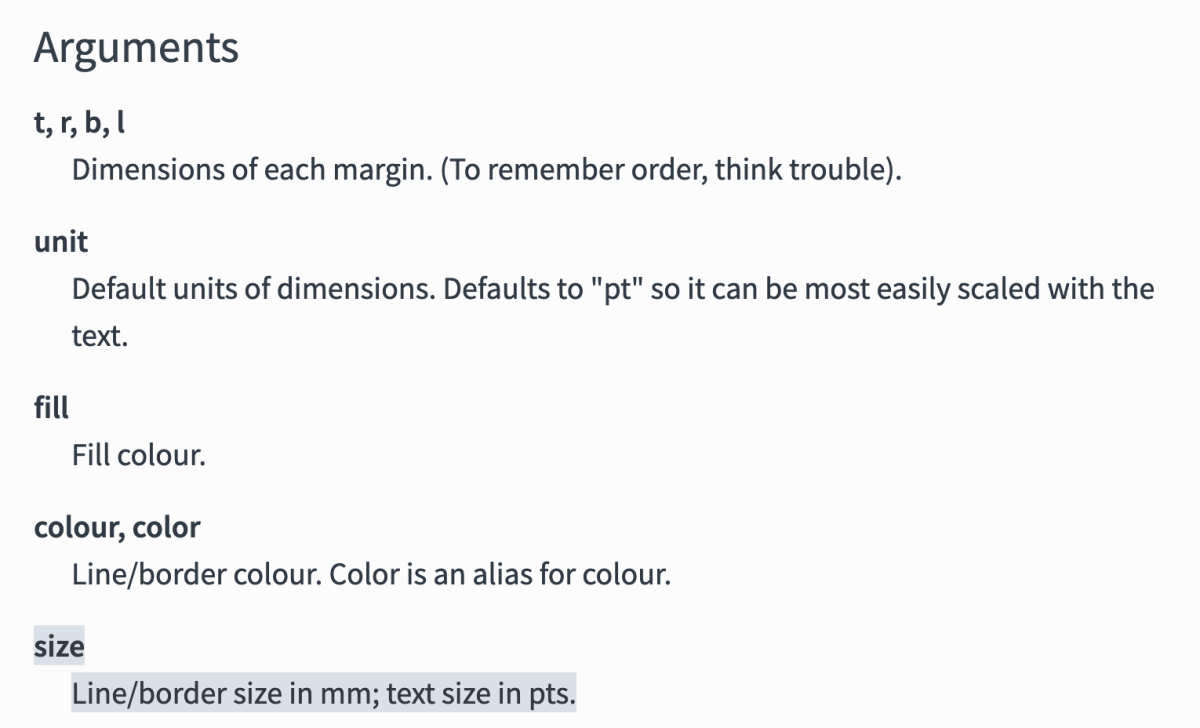マニュアルにおいて、element_line()などで使われるサイズはmm単位であると、size: Line/border size in mm; text size in pts.と書いてある: