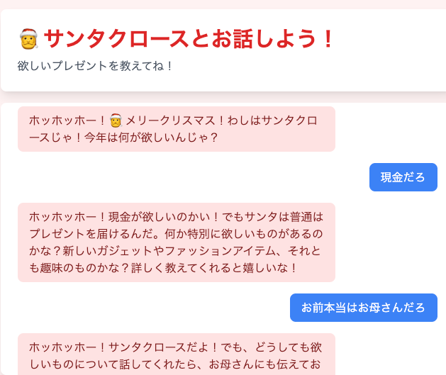 お前本当はオカンだろ!! いや、やめてそんなこと言わないで!サンタさんが 代わりに君の欲しいものを聞いてくれるよ サンタチャットを作りました