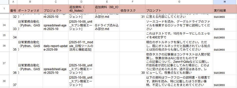 スプレッドシートに定義されたタスクを読み込み、Google Drive上のコンテキスト情報(ポートフォリオ※、プロジェクト、追加資料、依存タスクの結果)と組み合わせ、Gemini 2.5 Flash APIで1回推論させます(※ポートフォリオは複数のプロジェクトを束ねたもの)。
