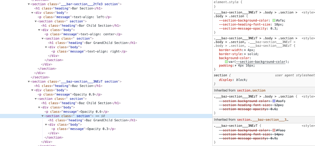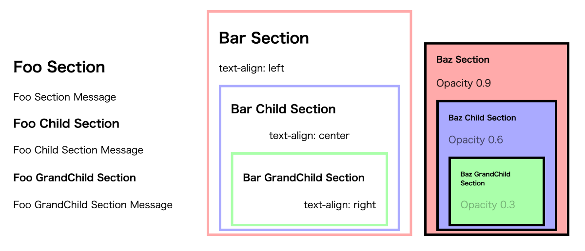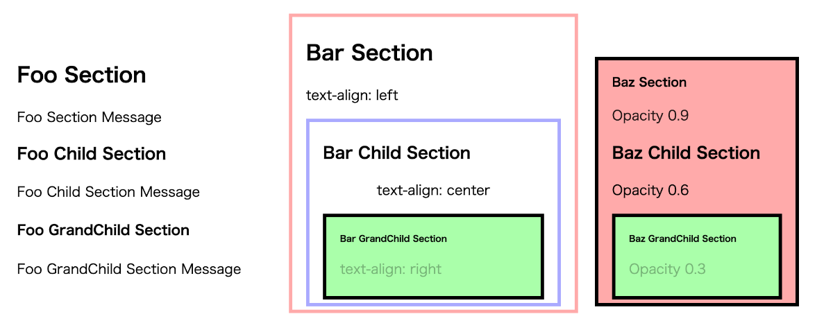 以下は2箇所だけ修正を入れて Baz Child Section のスタイルを外し、 Baz GrandChild Section のスタイルを Bar GrandChild Section にも適用した例です。