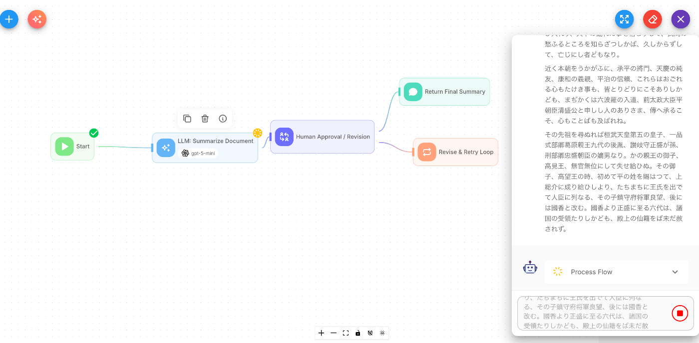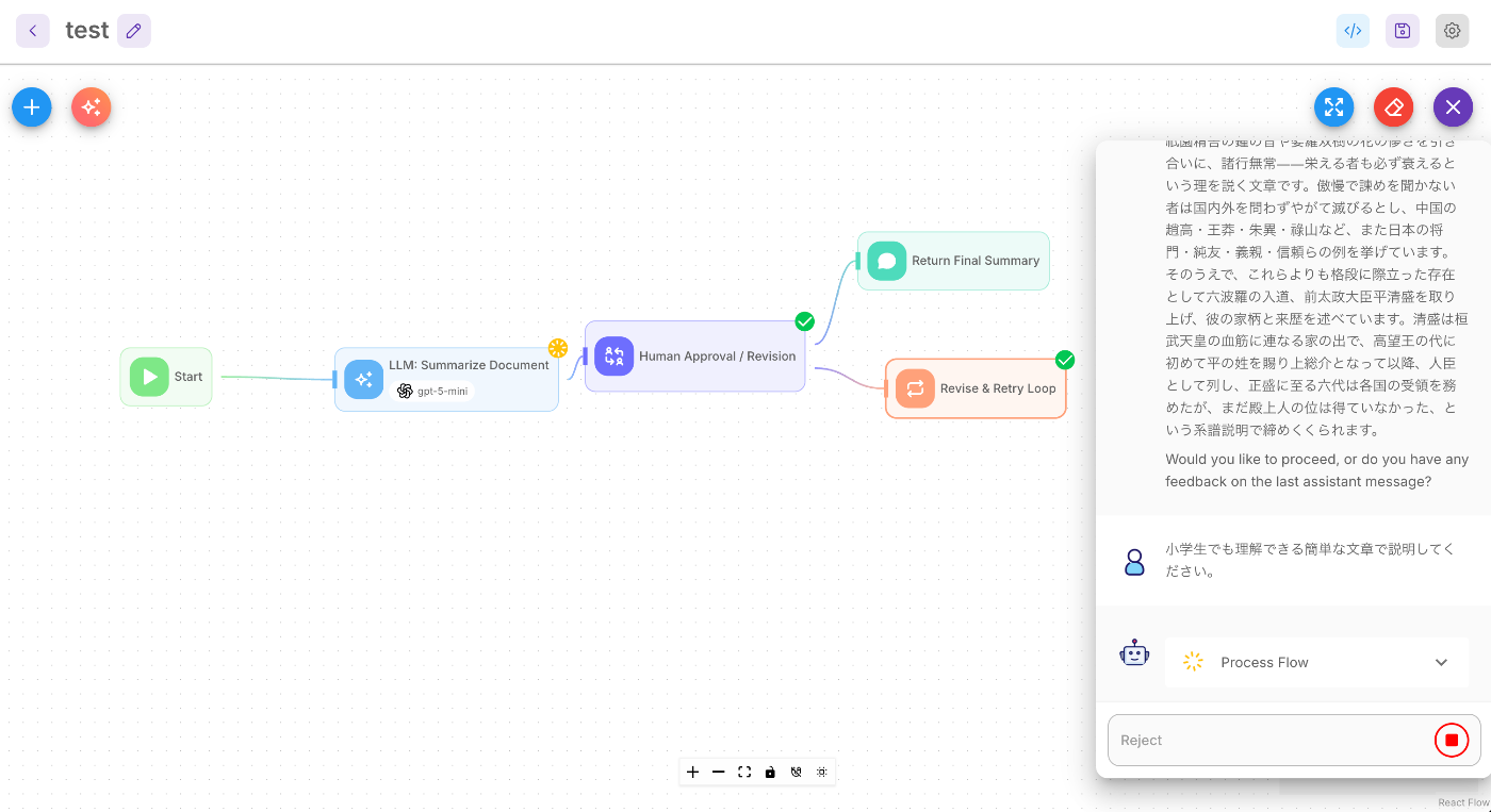 Human Approval / Revisionというノードが設定されているためLLMの回答に対して私がFBを与えることができます。