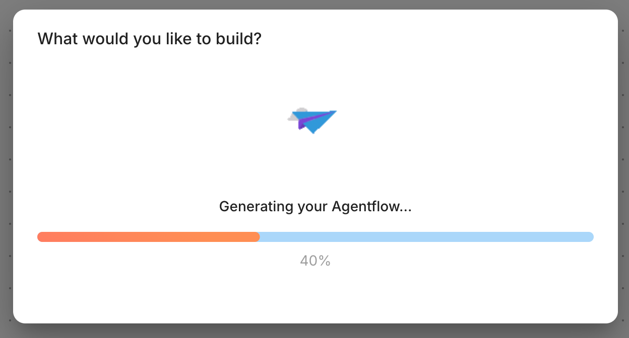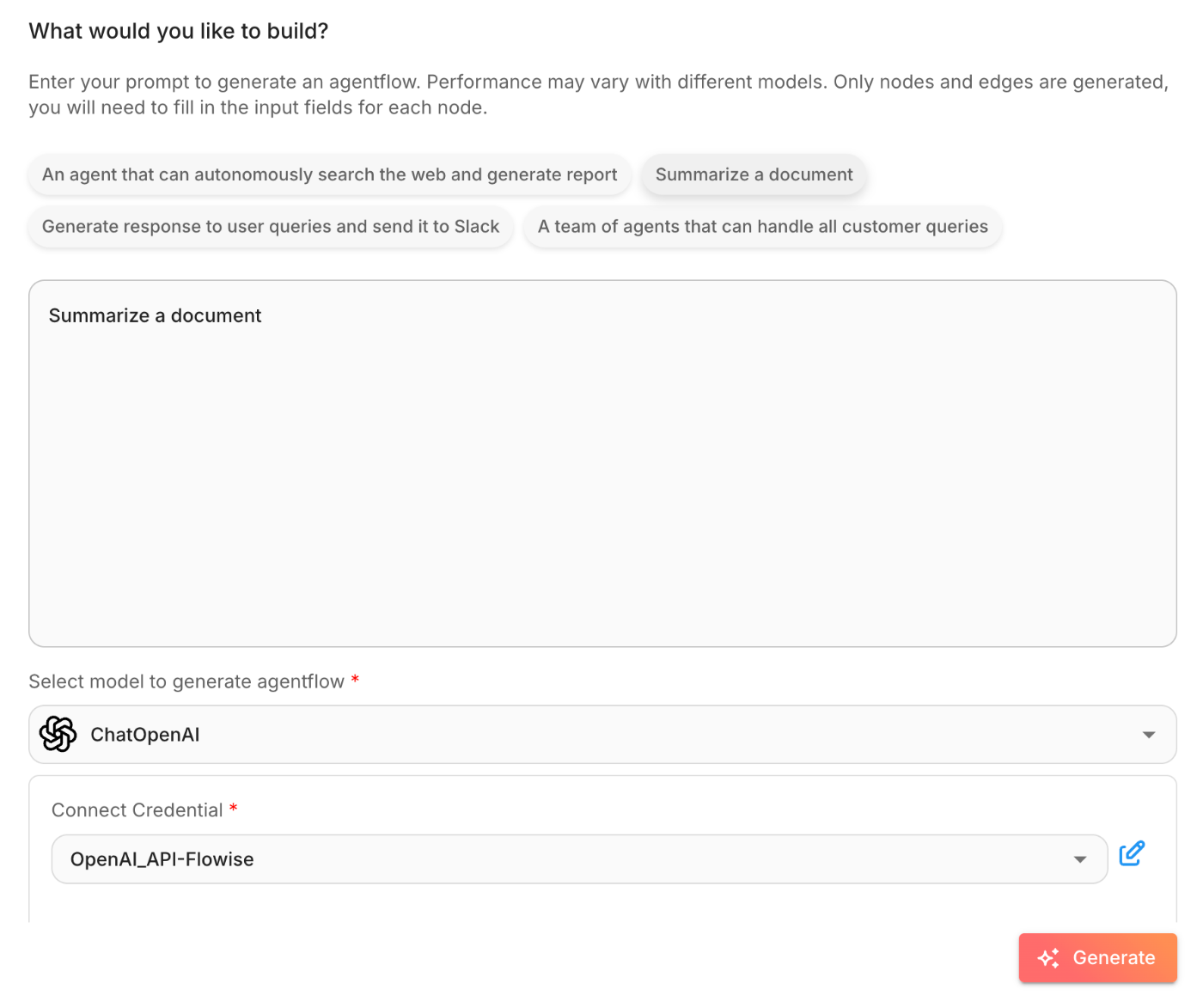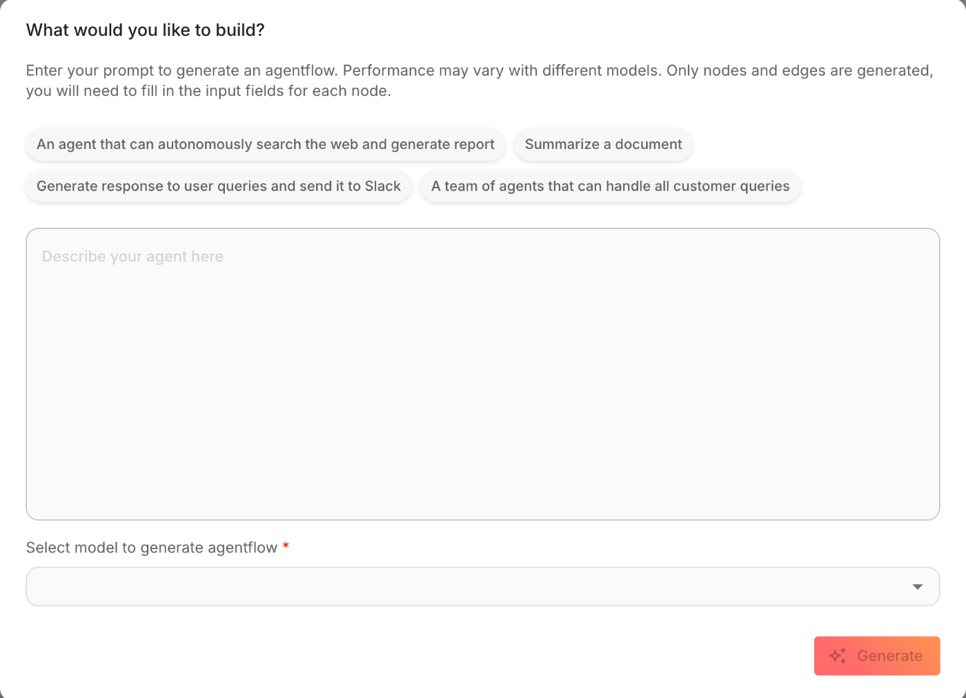 エージェントフローを生成するためのプロンプトを入力してください。パフォーマンスはモデルによって異なる場合があります。生成されるのはノードとエッジのみで、各ノードの入力フィールドに入力する必要があります。