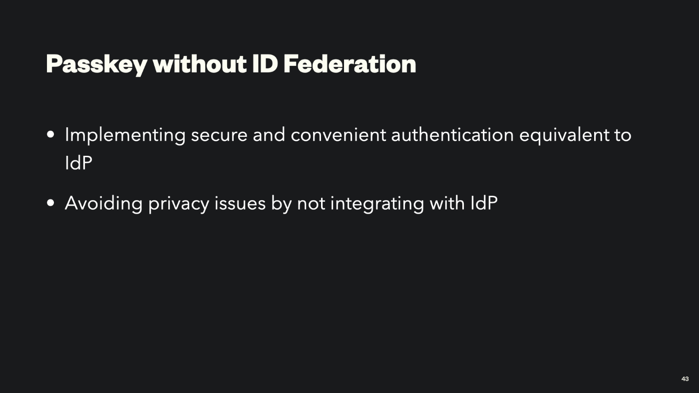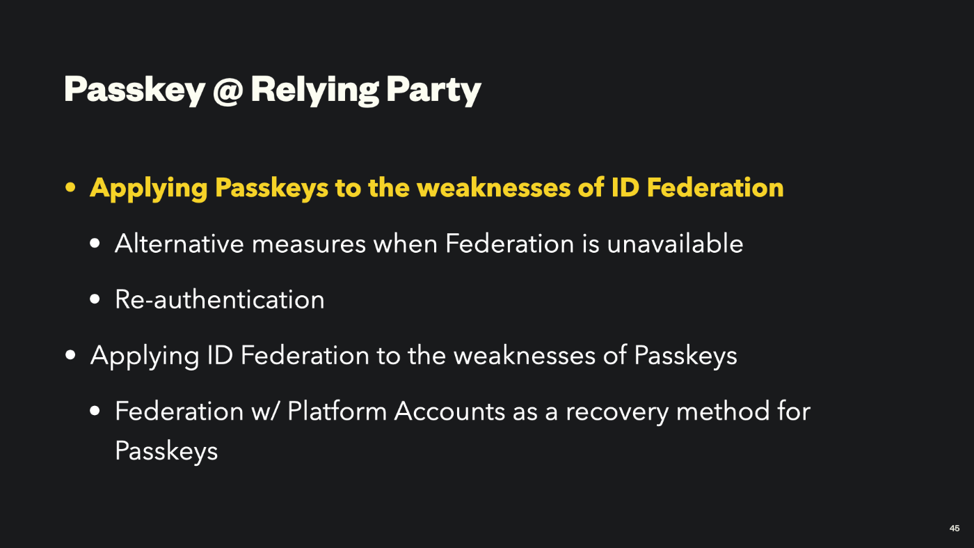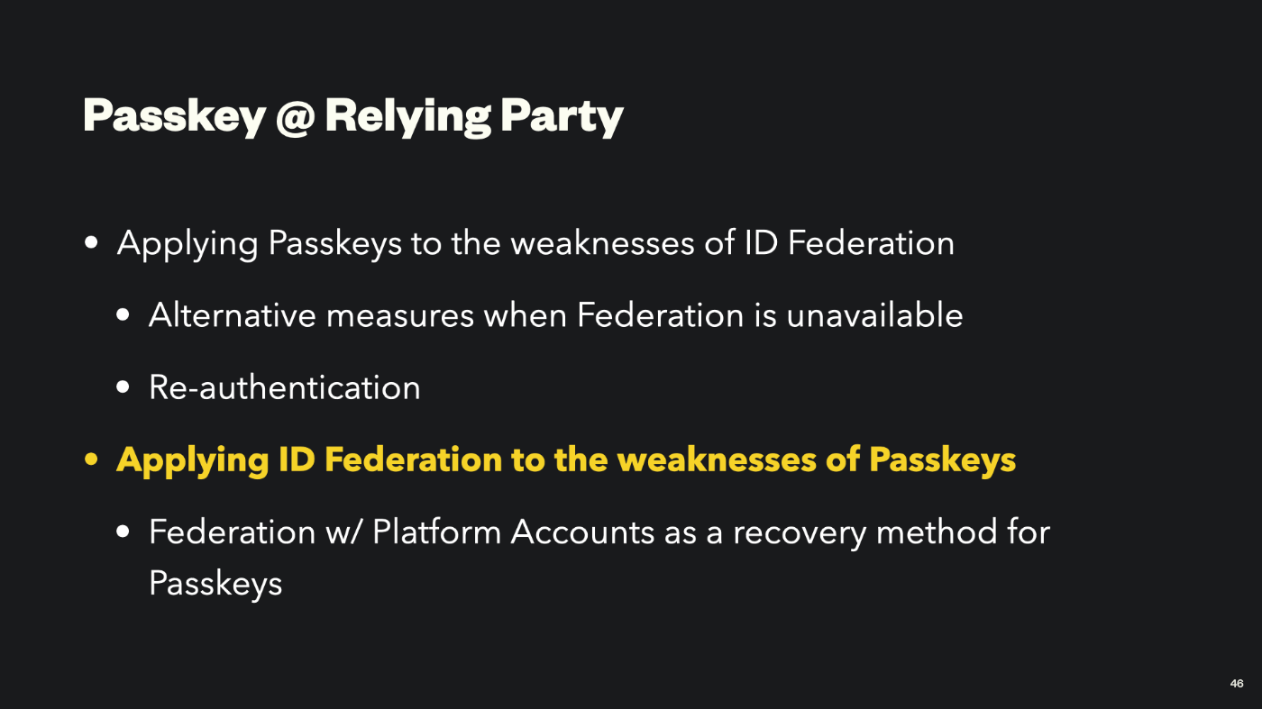 このID連携とパスキーの組み合わせに関するアプローチは、今後パスキーのみを認証方式として利用するサービスのリカバリーやフォールバックの課題を解決する方法として議論されていくと思います。