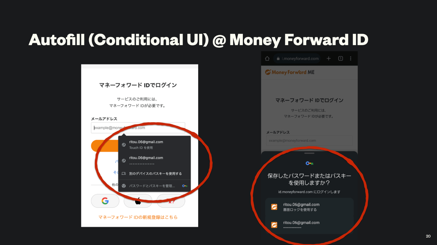 同じくAutofillを利用しているMoney Forward IDのログイン画面では、PCとモバイル端末のどちらのブラウザでも、利用可能なパスキーに加えて、パスワードの候補も表示されています。