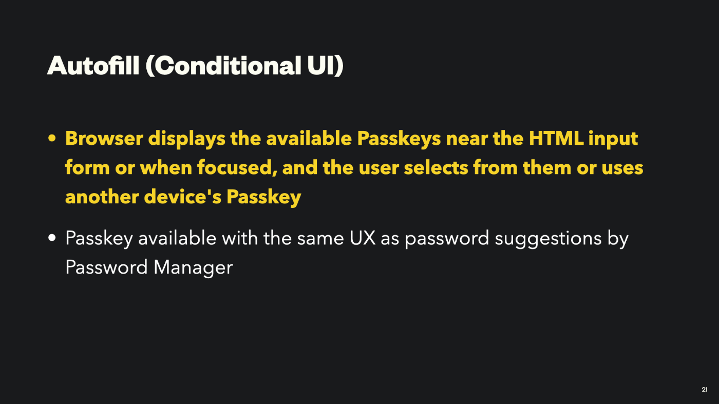 ここからわかるとおり、「Autofill」は、パスキーをこれまでのパスワードマネージャーが管理していたパスワードと同じUIで利用できる仕組みです。パスワードからパスキーへの移行を考慮する上でもとても重要な機能です。