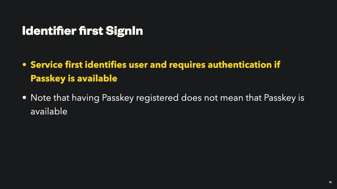 ユーザーはログイン画面で、ユーザーの識別子を入力します。その後、サービス側でパスキーの登録状況を確認して、もしパスキーが既に登録されていれば、パスキーによる認証が要求されます。このような認証フローは「Identity Firstパターン」とも呼ばれています。