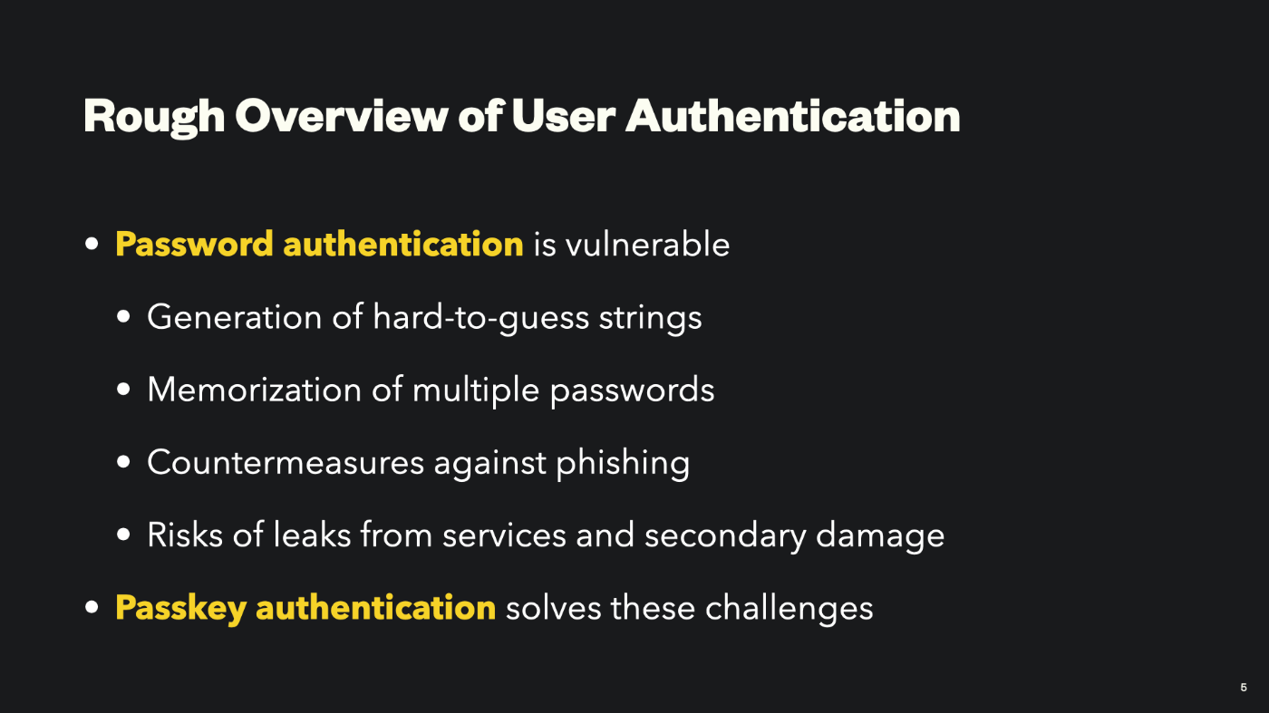 「パスワード認証は脆弱だ。ユーザーは推測が困難な文字列を作成できず、同じパスワードを複数のサービスで使い回し、フィッシング攻撃にも引っかかる。一つのサービスで情報が漏洩すれば、他のサービスでも不正ログインされてしまう。」