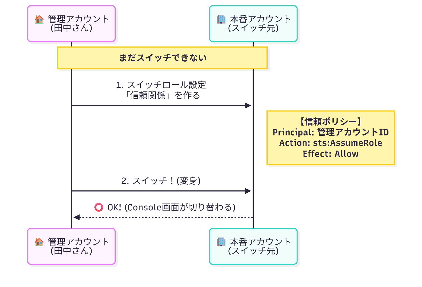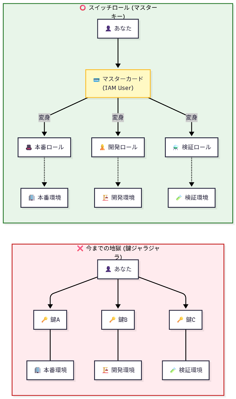 たった一つの「マスターキー(IAMユーザー)」でログインし、あとは許可された部屋(別のアカウント)へ「変身」して入室します。