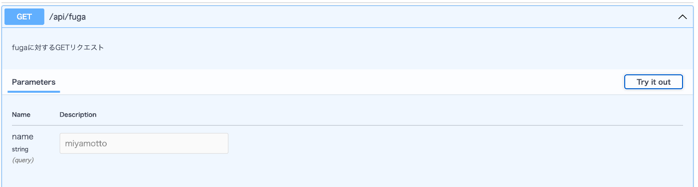 GET api/fugaはクエリパラメータを取得してそれに応じたmessageをJSONで返します。