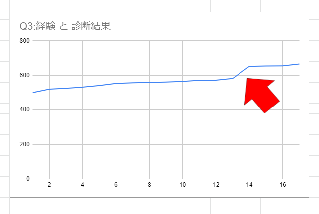 グラフの中で特徴的なところがある。Q3の選択肢を一つずつ増やしていくと14個目の選択肢(index:13)で急に上がっていた。