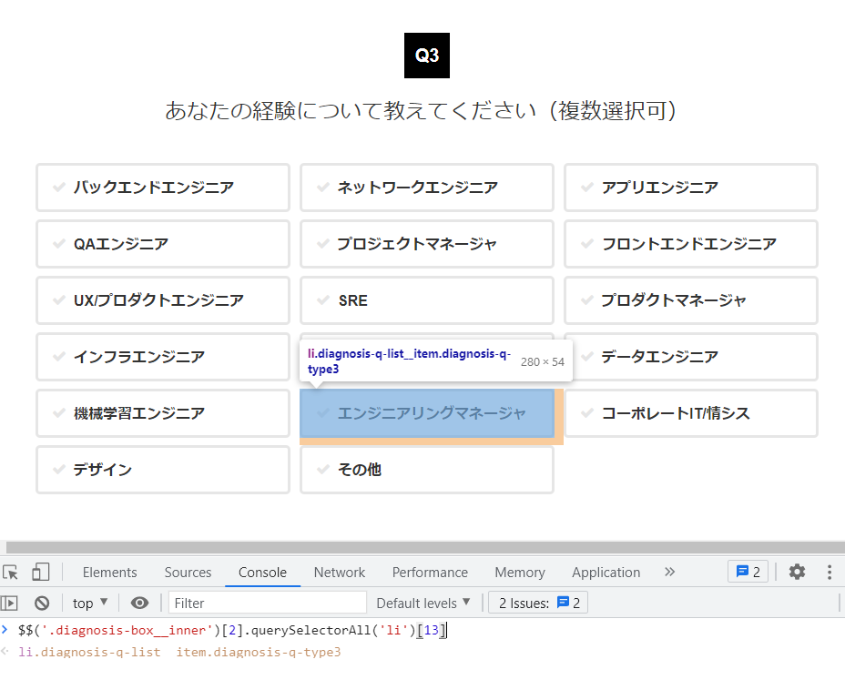 Q1の経験年数は択一で選択必須、Q2の得意分野とQ3の経験については1個以上選択必須で複数選択可、Q4は必須ではない。なのでQ1,Q2,Q3を一つずつチェックするのがバリデーションが通る最低限の状態で結果は500万円になる。とりあえずこれをベースにQ2,Q3の選択個数を増やしていって結果を見てみたい。