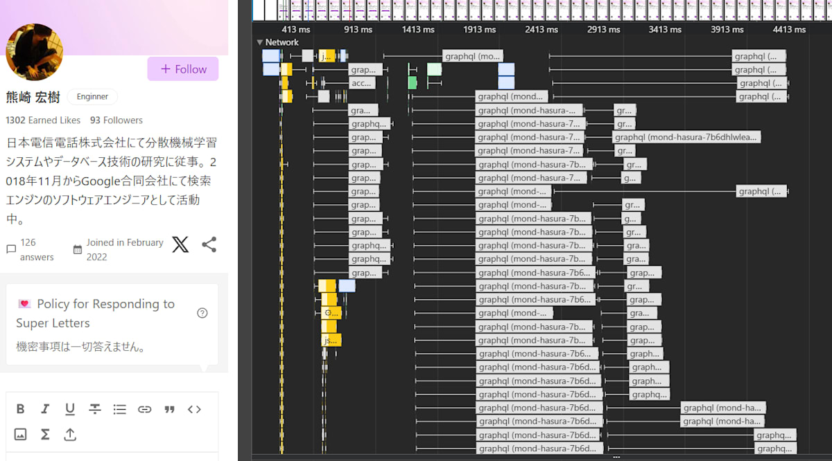 User answers to questions are in an infinite scroll list view, and each list item issues about 5 to 10 additional requests for its own detail resolution. I see, that's heavy.