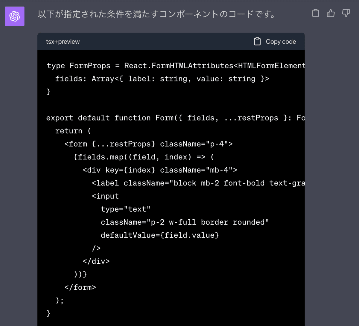 - コードブロックの属性は ```tsx+preview としてください
