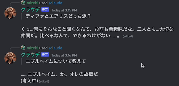 - claude3 にストリームモードでリクエストし、5秒ごとに現在のバッファでアップデートをする(discord で一度書き換えたら edited になるアレ)