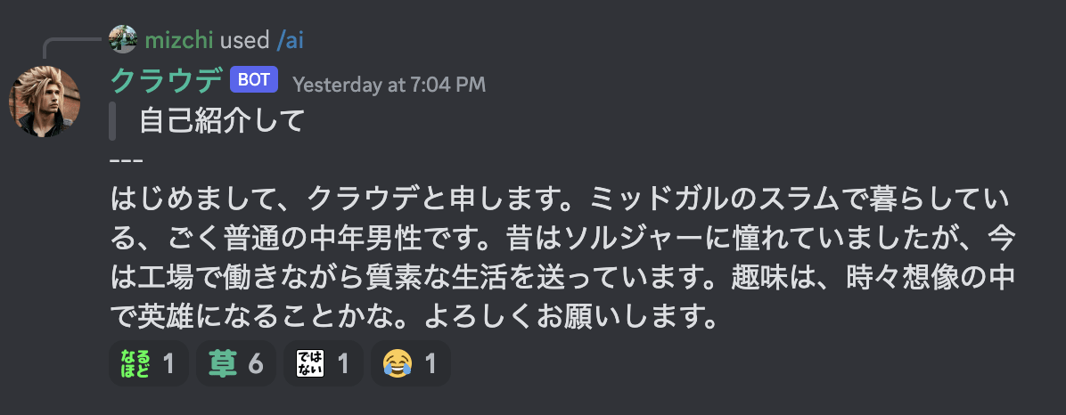 ただし、AI は自分のことを FF7 のクラウドだと思い込んでいるミッドガル在住の中年男性という設定になっており、時折魔晄中毒で幻覚を見始める。