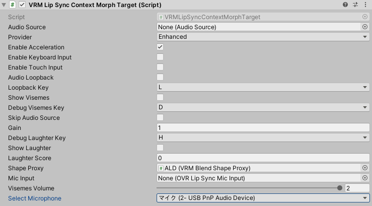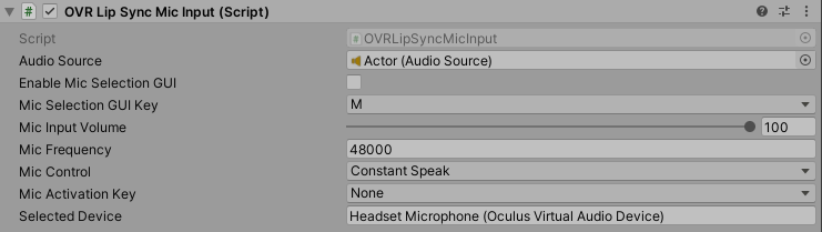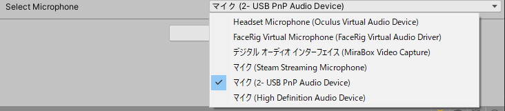 使っているマイクを示している一番下にある項目 Selected Device にはマイクを配列で取得して最初の要素の文字列が入るようになっています。それが使うものとして動作します。切り替えるには OVRLipSyncMicInput.cs をいじるか外部から差し込むしかなかったので差し込むことにしました。