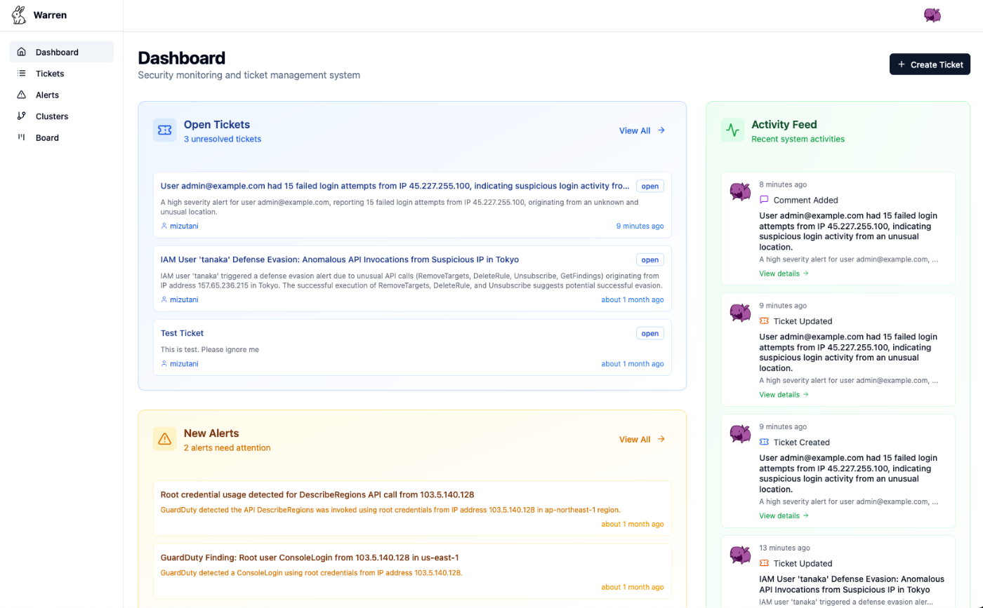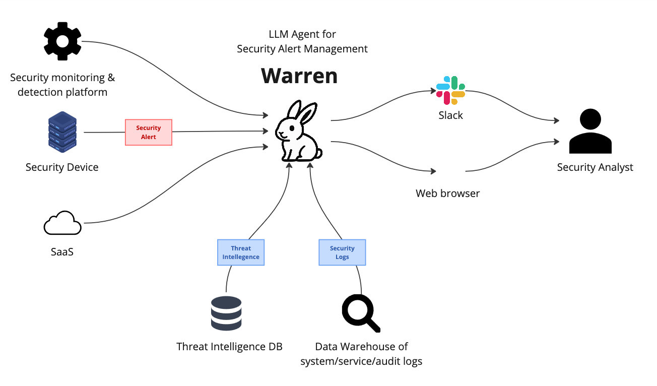 このエージェントはWebサービスとして動作してセキュリティアラートを外部システムから受け取り、Slackと連携して分析ができるような仕組みになっています。具体的には、EDRやファイアウォールなどのセキュリティシステムからアラートがwarrenに送信されると、それがSlackに通知され、ユーザーはSlack上でエージェントと対話しながらアラートの分析を進めることができます。