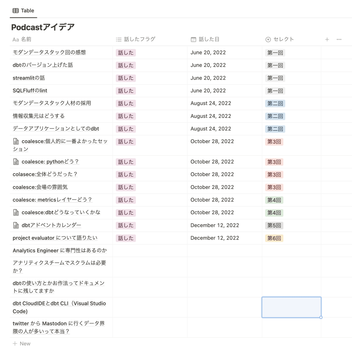普段から podcast のネタになりそうだ、と思ったことを notion のメモにまとめておいて、そのメモをみながら話しています。